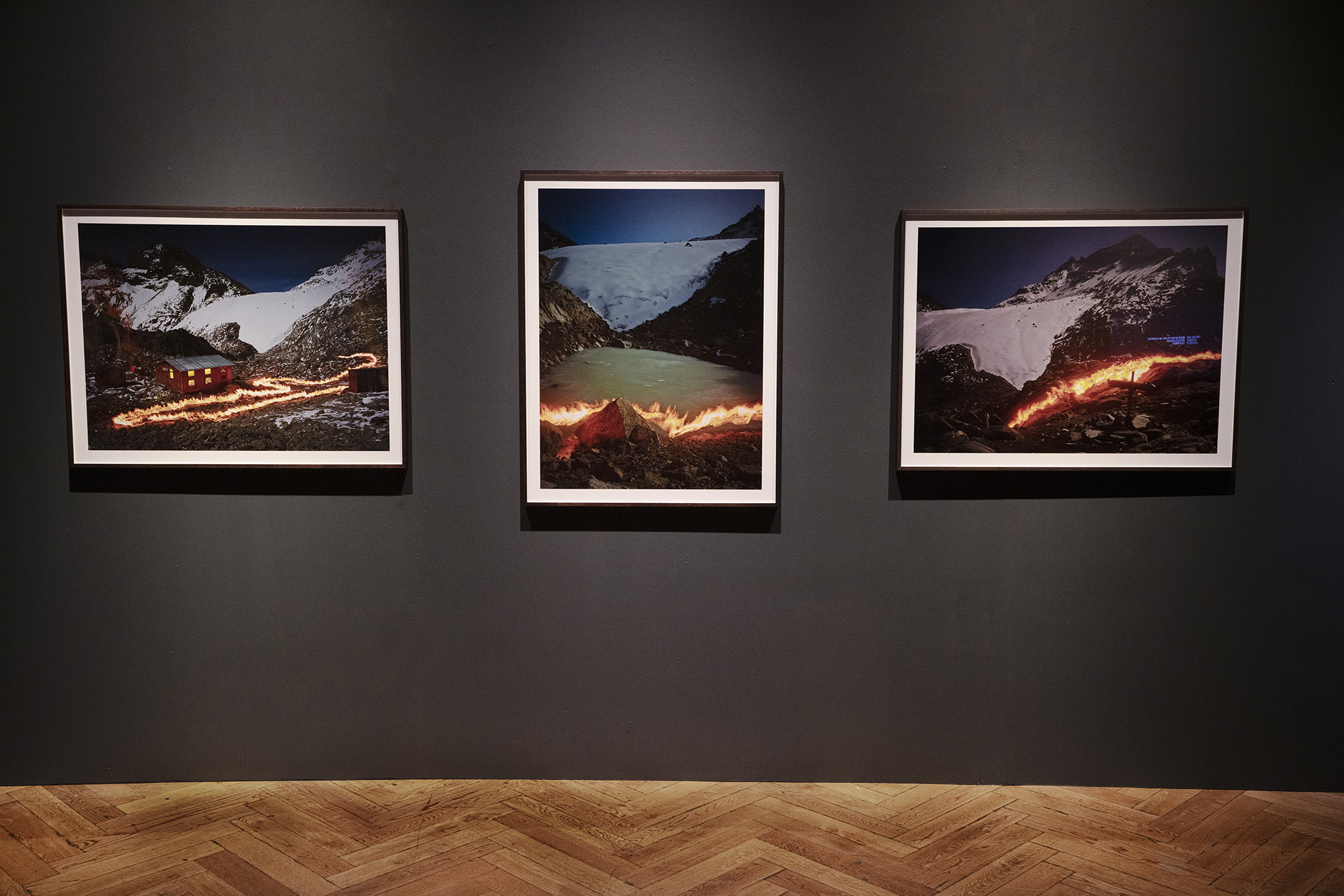 In October 2014 Simon Norfolk traced the previous glacial area of Lewis Glacier, Mount Kenya, using fire to show the 1965 glacier extent. The result are comparative images representing the historic as well as the current glacial front. In utilising a dramatic juxtaposition of elements alongside a simple message, Norfolk produced highly potent artwork. This series was the winner of the Sony World Photography Award 2015 (landscape category).