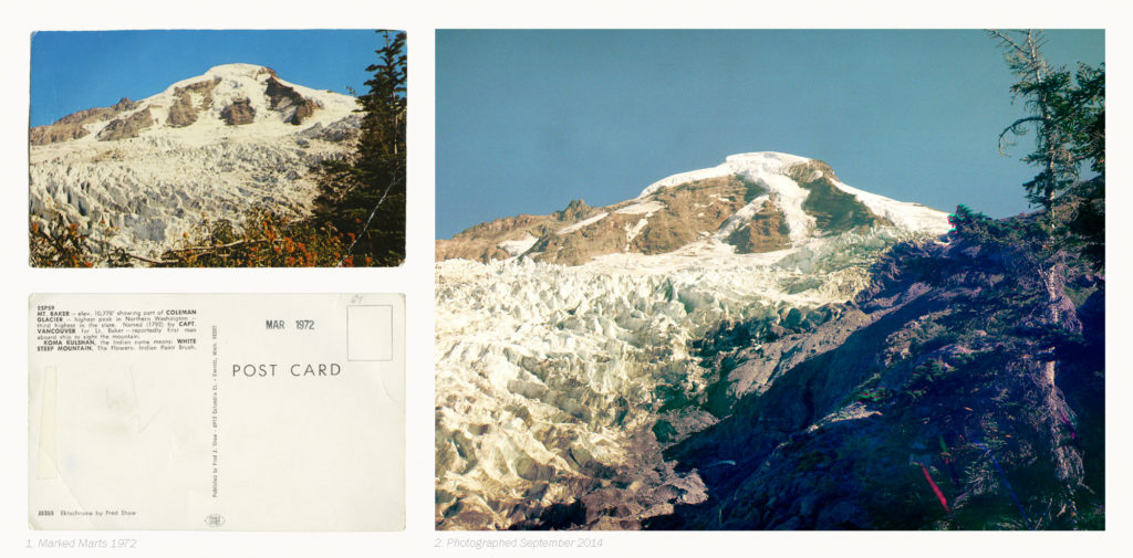 I realized in this moment, seeing it for the first time, with the forty-two year old (almost my age) photograph in hand, just how much the glaciers have been receding. The top of the Coleman Glacier is still very similar. I could see the same crevasses cutting their deep lines across the Mountain’s surface… but these lines ended abruptly. Whereas before the ice extended to reach the cliff I stood on, going beyond the composition of the old postcard, it was now dusty bedrock, naked and grey. This wasn’t the huge recession I had seen in comparison photos. I was closer to the top of the glacier where less melting occurs. But it was real and clear and in front of me. The surrealism deepened as I imagined the ebb and flow of time, precipitate accumulation, melting, erosion, day and night, summer and winter, months, centuries, the relative fragility of the glacier, the fragility of myself compared to the ice, and a future person standing in my shoes wondering maybe the same things.