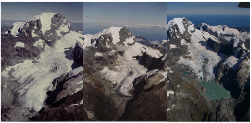 Comparative images of Donne Glacier, NZ, from left to right, 1981, 1998, 2009. Source: Trevor Chinn